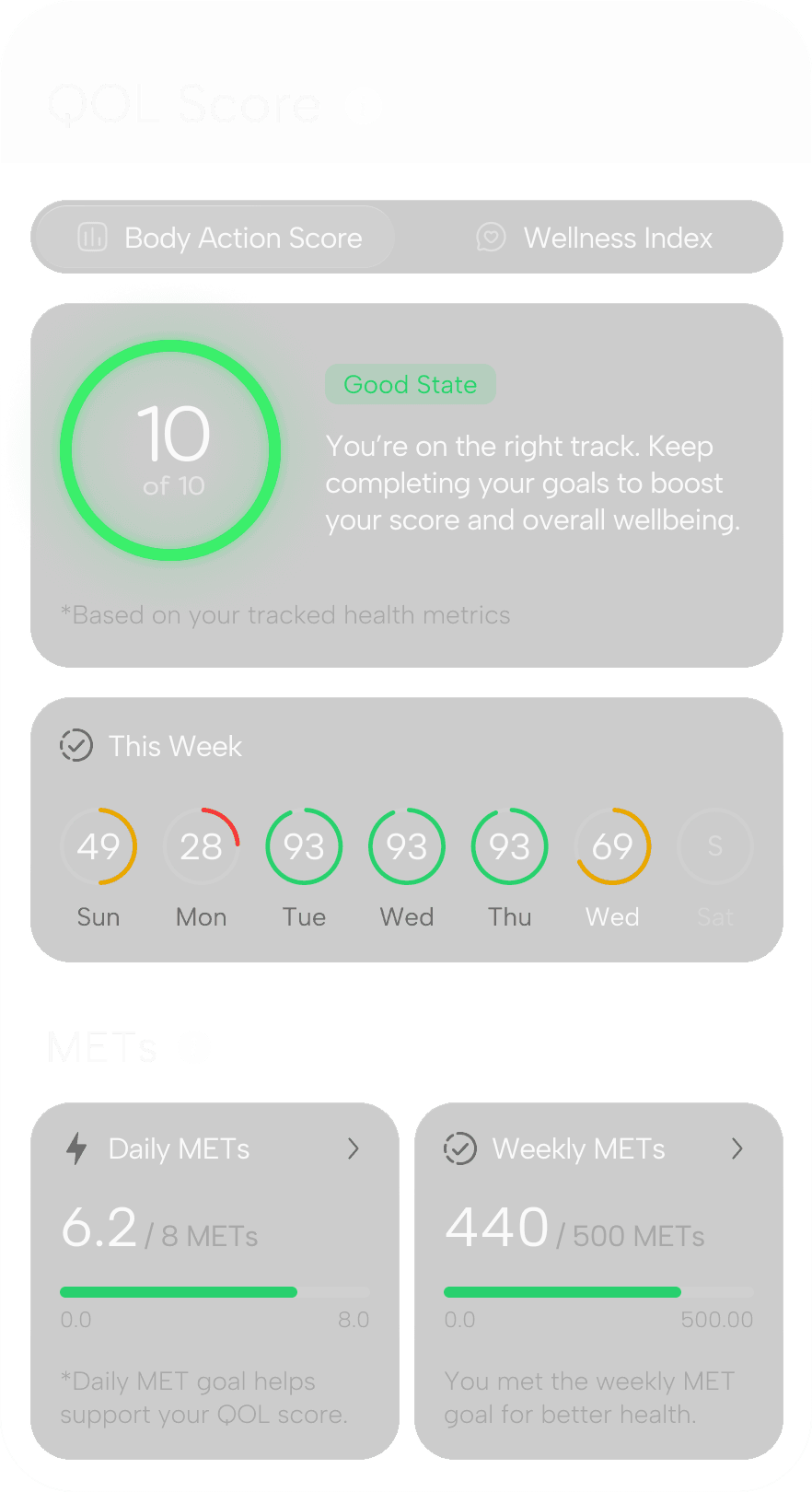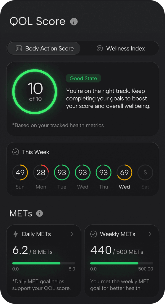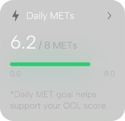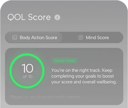 Our dual health QOL score system shows not just how you’re doing, but why. See the connection between physical metrics and emotional well-being, enabling you to fine-tune daily routines for better balance, energy, and long-term health.