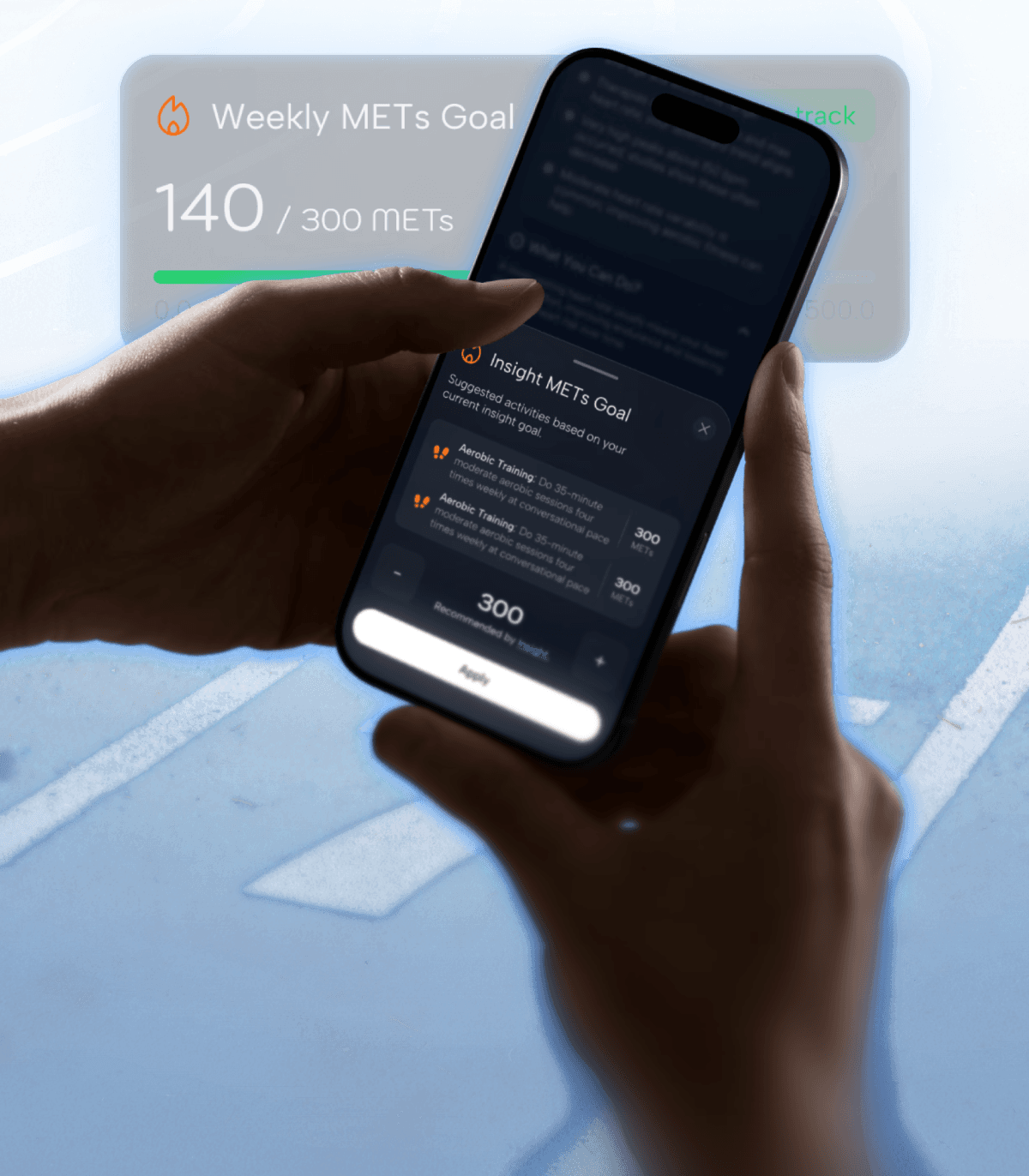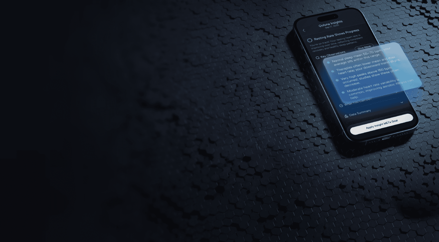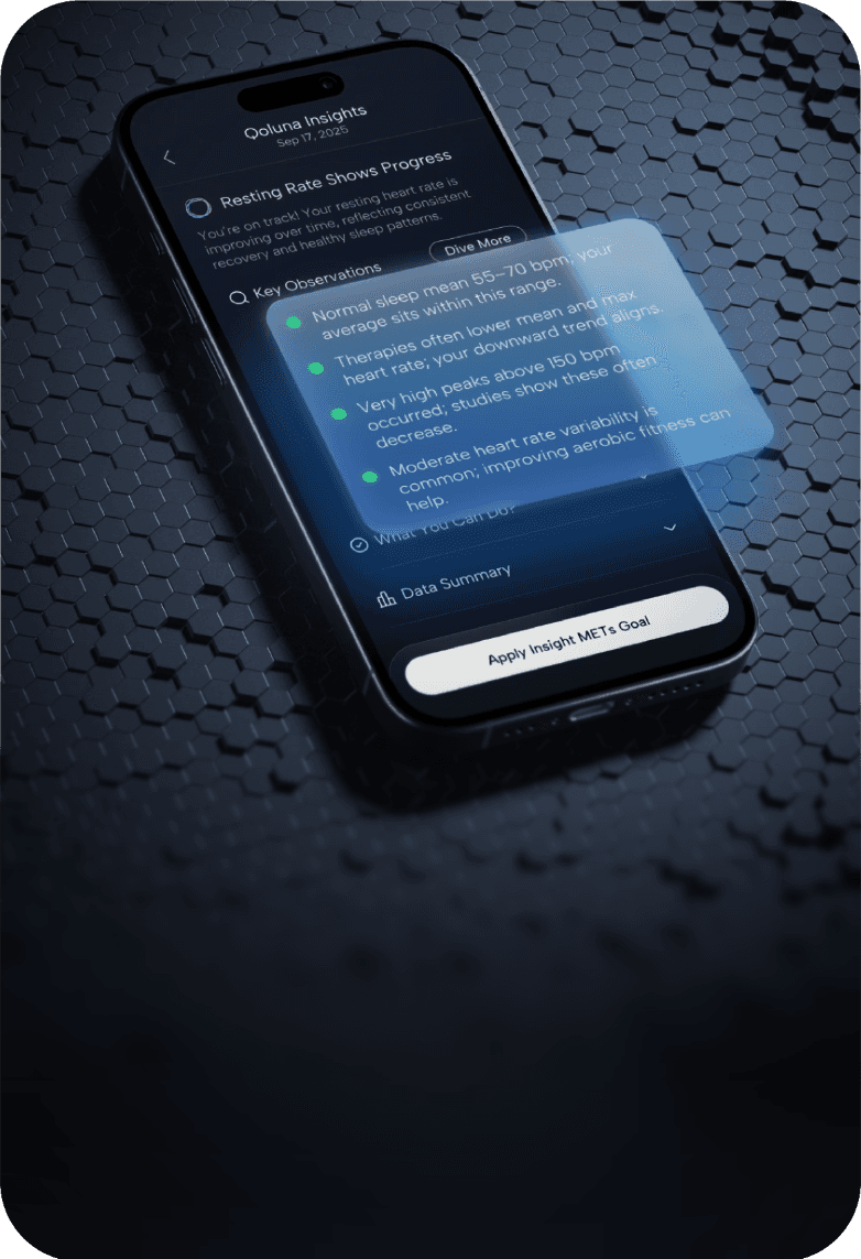 Qoluna sets personalized, Metabolic Equivalent Task (MET) based targets aligned to your baseline and continuously recalibrates them. As your data changes, your goals evolve. Every action is intentional.