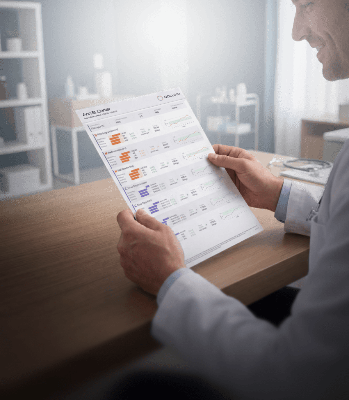Qoluna generates a structured, physician-ready report built from your data. Clinically relevant findings. Correlation insights. Leading questions to discuss with your physician. You stay informed and participate in decisions.